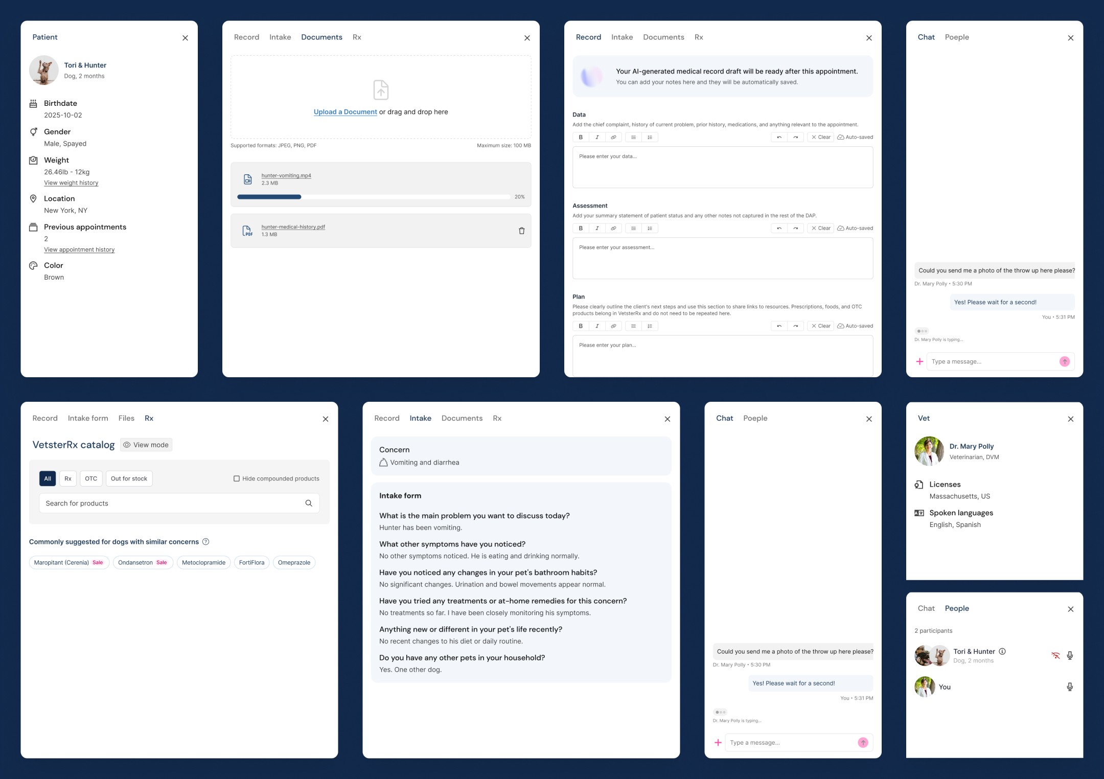 Embedding virtual care into PetSmart stores. A seamless journey from intake and telehealth eligibility through RVT chat, vet appointment, and finalized medical record.