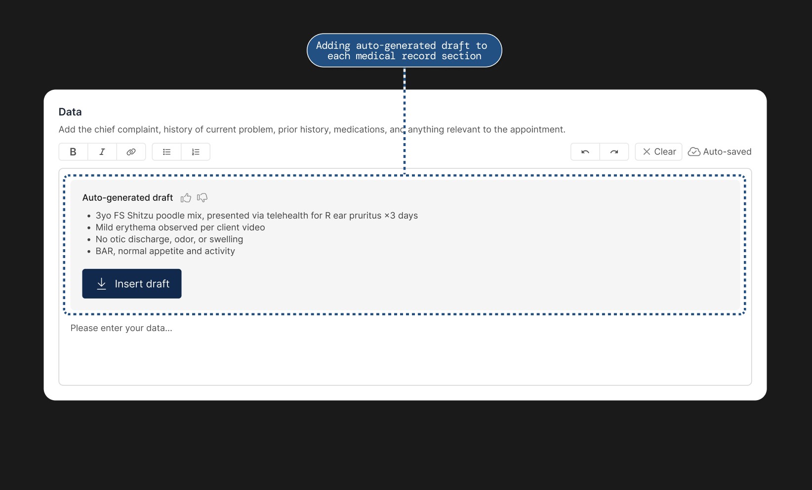 Through competitor analysis of similar features and conversations with veterinarians, we learned that generating a single long draft or inserting content directly into text fields created friction. Instead, we designed auto generated drafts for each section, allowing veterinarians to review, edit, and insert only what they need. These drafts appear within each text field, making it easy for veterinarians to compare generated content with what they have already written or still need to complete. This approach also established a strong foundation for future enhancements, such as regenerating drafts at a section level and incorporating additional data sources beyond appointment transcripts.