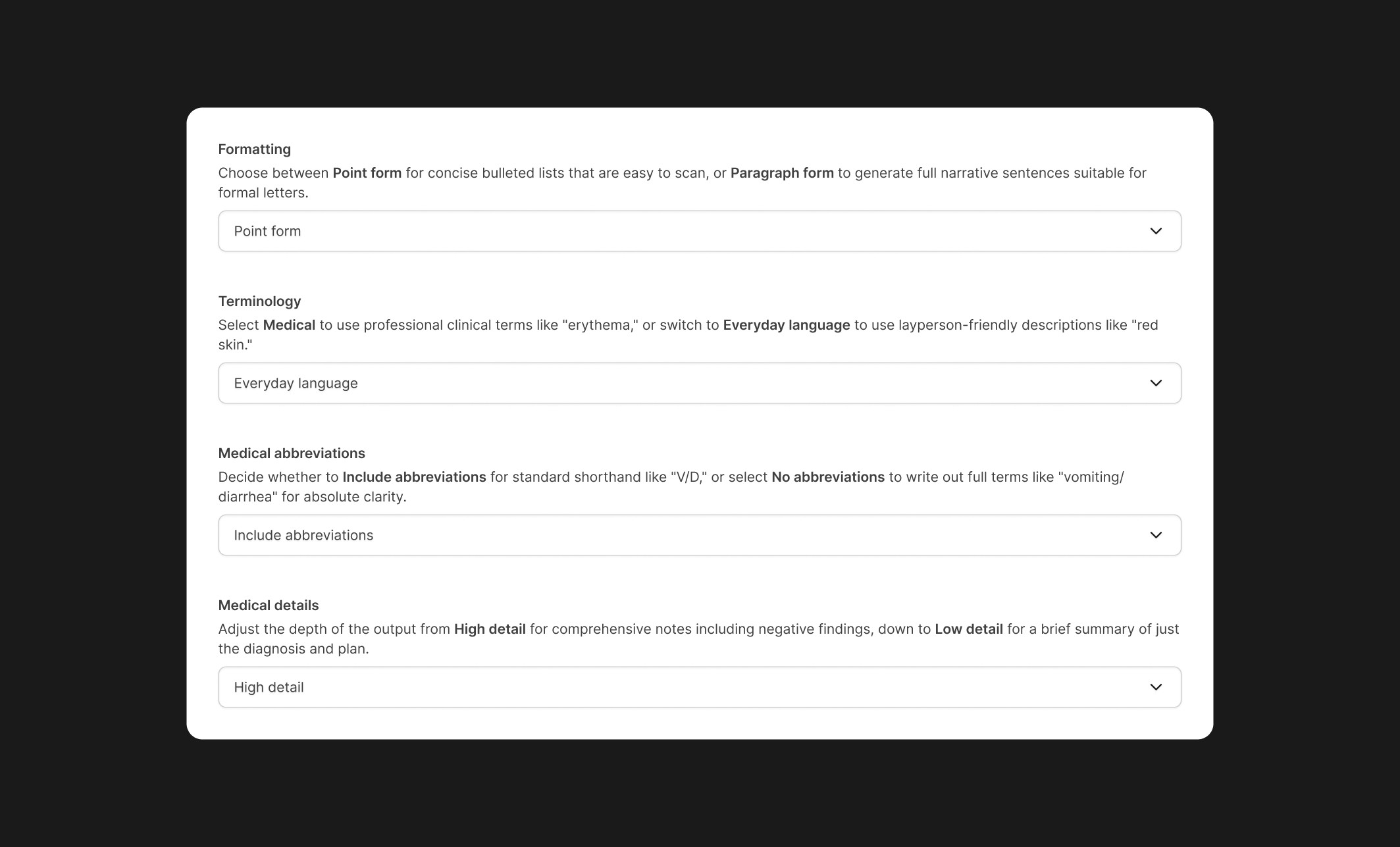 For each appointment, veterinarians can regenerate the draft up to two times if the initial version does not meet their needs. We also introduced format settings that allow vets to choose between point form or paragraph form, with or without abbreviations, everyday language or medical terminology, and varying levels of detail. This flexibility supports different documentation styles across veterinarians.